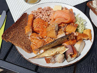 Aufgrund so vieler sehr guter Empfehlungen in einer SPO-Facebook-Gruppe - zog es uns hierher für einen Mittagssnack. Wer das nicht weiß, der könnte dieses unscheinbare "Juwel der Fischküche", womöglich verfehlen. Eingekesselt zwischen einem Discounter & dem "Kaufhaus Stolz" gelegen - ist es leicht zu übersehen. Zum Ambiente im Innenbereich können wir nichts beitragen - platzierten uns umgehend auf der Außen-Terrasse. Diese ist lediglich zweckmäßig gestaltet - und obwohl 'purer Sonnenschein' & sich einige Gäste in der dazu herrschenden Hitze, offenkundig nicht wohl fühlten, sowie anführten (sogar in den Innenraum wechselten) - wurde die (durchaus vorhandene) Markise als Schattenspender - nicht ausgefahren. Das - leider - ist der Grund für Punkte-Abzug in der Bewertung. Wir wollten nur einen Snack zum Mittagessen...und so bestellten wir die Räucherfisch-Platte für knapp 19 Euro - zum Teilen durch 2. Die war dann wirklich DER HAMMER! Butterfisch, Aal, reichlich Krabben, Makrele, Schillerlocke & weitere Vielfalt an Geräuchertem. Top ! (Vielleicht ein wenig mehr Brot dazu, wäre gut) Die Portion war - selbst für 2 Personen - ausgesprochen reichlich, von hoher Qualität & sehr sehr lecker !