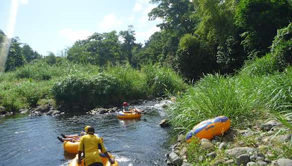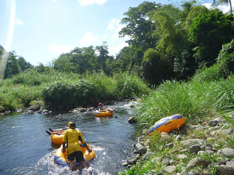 Wir mieteten ein Taxi und vereinbarten eine Inselrundfahrt und River Rafting um 60 $/Person. (Über Internet 45$/Person exkl. Transfer) . Wir fuhren vorbei an Kakao- ;Mango-; Papaya- und Muskatbäumen hinauf zum höchsten Punkt der Insel ( 582m) durch den Grand Etang Nationalpark wo wir nach einem 10minütigem Marsch durch den Regenwald auf einen Aussichtspunkt kamen von dem aus der Kratersee zu sehen war. Am Balthazar River angekommen wurden wir gleich mit Helm und Schwimmweste ausgestattet und auf ging es mit riesigen Reifen in den Fluß. Zu unserer Überraschung war das Wasser nicht kalt, allerdings wäre es bei einem etwas höheren Wasserstand spektakulärer gewesen. So ging es gemütlich durch die Landschaft und nach etwa 30 Min. erreichten wir den Ausstiegspunkt, wo wir schon von unserem Driver erwartet wurden. Beim Fruit Juice zwischen riesigen Blumen flatterten Kolibris. Ein schöner Ausflug, dauert etwa 3 Stunden und ist auch mit Kindern leicht machbar. Wird auch vom Schiff angeboten, allerdings viel teurer.