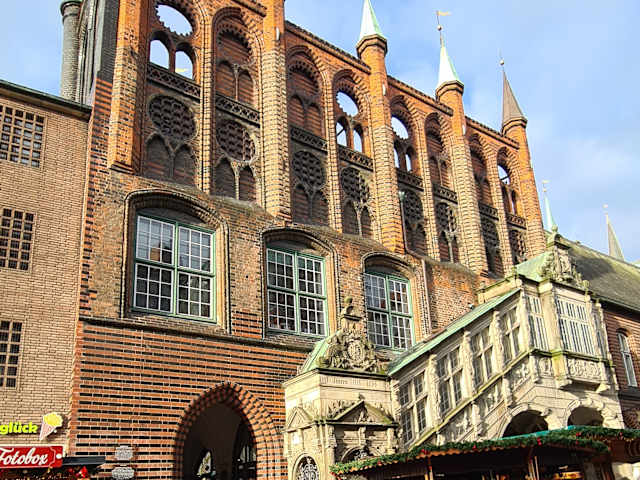 Das Rathaus ist eines der bekanntesten Gebäude in Lübeck, es ist ein mittelalterlicher Backsteinbau. Im Jahre 1251 gab es einen Stadtbrand in Lübeck bei welchem auch der Vorgängerbau zerstört wurde. Dann wurde im Jahr 1298, nachdem das Rathaus wieder erbaut war, das Lange Haus angebaut, welches auch jetzt noch sehr gut dasteht. Heute ist von den vielen Um und Anbauten in erster Linie die weisse Renaissancelaube, sowie die gotische Schildwand daß, was die meisten nur als das Rathaus wahrnehmen. Das Lange Haus mit seinen Granitpfeilern werden von den Touristen durchschritten, ohne daß man es als Teil des Rathauses erkennt, dabei ist es so wichtig. Denn die herrliche Renaissancetreppe, die davor, aber auf der Breiten Straße steht ist, ein Juwel. Sie wurde im Jahr 1594 von niederländischen Bildhauern erbaut. Sehr schön ist auch der Renaissance - Erker, von welchem sich das Hauptgebäude hinzieht, welches erst 1880 erbaut wurde. Das Rathaus ist jetzt nicht nur der Regierungssitz des Bürgermeisters, auch der Versammlungsort der Bürgerschaft.