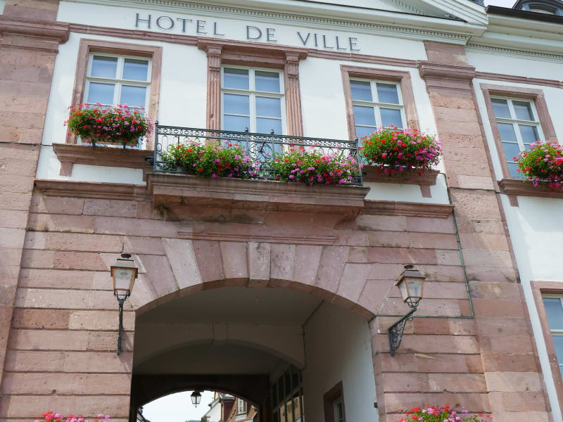 Dieses Rathaus kennt sehr wahrscheinlich jeder Besucher, der mit einem Auto oder Bus anreist. Alle Gäste gehen durch das Tor, welches in der Mitte des Rathauses ist, um in den Ort zu kommen. Das Rathaus wurde viel später erbaut als die Stadt., im Jahr 1810. Der Erbauer war ein Architekt aus Colmar. Es hat in der Mitte einen Fries der das Tor umschliesst.