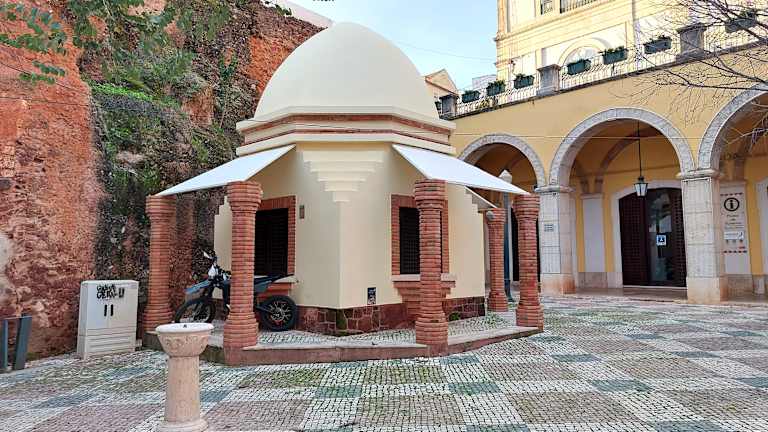 Mitten in der Altstadt (noch in der Unterstadt), am Platz Praça do Município, befindet sich das Rathaus von Silves. Der Platz vor dem Rathaus wird von unterschiedlichen Bäumen beschattet, zudem befindet sich hier ein ganz netter Brunnen und auch das Archäologische Museum ist hier angesiedelt. Das Rathaus ist noch in der Unterstadt, jedoch befindet sich nur wenige Meter entfernt das alte Stadttor hoch zur Oberstadt. In den Arkaden im Erdgeschoß des Rathauses findet man das „Café Rosa“, in dem man gute Kuchen und Gebäckstücke bekommt. Die Innen-Wände vom Café Rosa sind mit blau-weißen Azulejos verkleidet – und diese Azulejos sind nach meiner Meinung absolut sehenswert. Im Rathaus ist auch die Touristen-Information von Silves untergebracht.