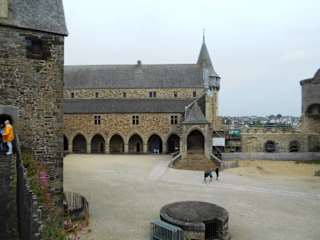 Im Innenhof der Burg ist der Eingang zum Rathaus („Mairie“) von Vitré, das integraler Bestandteil des historischen Gebäudekomplexes auf dem Felsen oberhalb des Flusses Vilaine ist.
