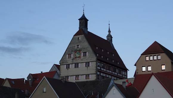 Das schöne Rathaus am Marktplatz in Besigheim wurde im Jahr 1459 erbaut. Zunächst war es ein Kaufhaus, weil im Untergeschoß eine Markthalle war. Im ersten Stock befand sich der Tanzboden, hier wurden alle Festivitäten abgehalten. Im zweiten Stock wurde Gericht gehalten. Bei der Renovierung im Jaht 1977 fand man an den Wänden Malereien und an den Decken Stuck. Diese Kunstwerke wurden wieder restauriert. Heute befindet sich dort das Rathaus.