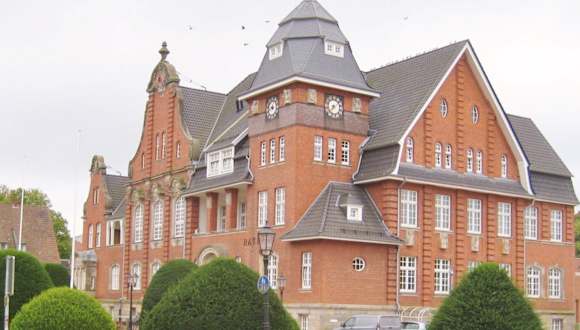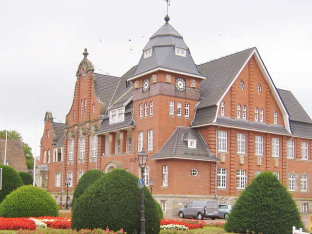Das historische Rathaus mit seinem sehr schönen Vorgarten wurde 1989 zum Kulturdenkmal erklärt, wobei der Vorgarten als Teil der Anlage mit einbezogen wurde. Erbaut wurde das Gebäude in den Jahren 1911 bis 1913. Zu finden waren dort dann die Verwaltung / das Rathaus und die Wohnung des Bürgermeisters. Heute soll dort immer noch die Verwaltung ihren Sitz haben, weiterhin soll dort der Sitzungsort des Stadtrats sein. Auf dem Weg zum Eingang gibt es drei Bronzetafeln, Auf der mittleren Tafel ist zu lesen: „Rochefort-sur-Mer und Papenburg, 10. September 1988 = ein Hinweis auf die Partnerschaft der beiden Städte. Ob auf den Tafeln links und rechts davon Wappen zu sehen sind, könnte sein (?). Das Segelschiff auf der rechten Tafel passt z. B. zu beiden Städten. Noch näher zum Eingang hin liegt ein großer Anker. Er soll laut einer Quelle ein Symbol für die Städtepartnerschaft von Papenburg und Rochefort-sur-Mer sein. Quellen: Facebook-Seite der Stadt / dollard-route.de
