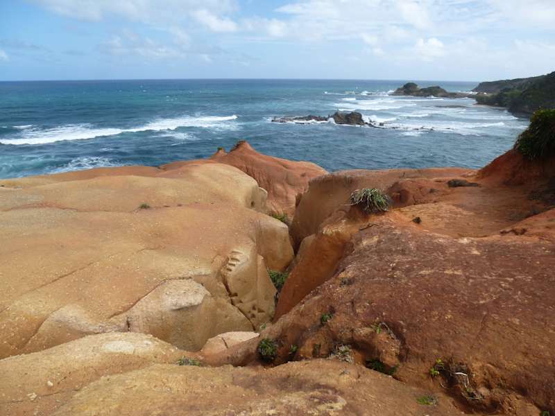 Vor dem Ort Calibishie im Norden von Dominica gelangt man auf einer wirklich holprigen Piste zum Wegweiser "Red Rock". Auf einem kurzen Trail kommt man zu den "Roten Felsen". Diese wurden durch Wind und Meer geformt bzw. kahlgeschoren. Der Anblick der kahlen "Red Rocks" mit der dahinterliegenden üppigen Vegetation und die Meeresküste - ein beeindruckendes Erlebnis! Hier gibt es auch einen kleinen Strand - jedoch nicht zum Schwimmen geeignet - tlw. starke Brandung und Meeresströmung! Zum Essen gibt es in Calibishie einige nette kleine Lokale! Alles noch sehr verschlafen.