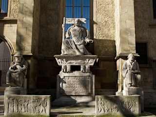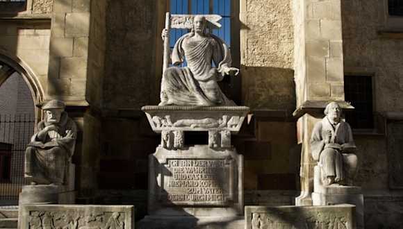 In der Einkaufsstraße, bei der Hospitalkirche, steht vor der Außenwand der Kirche das Reformationsdenkmal. Es wurde 1917, aus Anlass des 400 - jährigen Jahrestages der 95 Thesen Martin Luthers, errichtet. Es stellt Christus in den Mittelpunkt. Der wiederauferstandene Christus thront in mit Siegesfahne der Mitte. Links und rechts sind Sitzfiguren des Reformators Luther und des Reformators in Württemberg Johannes Brenz. Inschriftentafeln, aus dem Zeitalter der Reformation, sind weitere Bestandteile der abgeschrankten Anlage. Adresse: Hospitalstraße 19 - 15, 70174 Stuttgart Webseite: https://de.wikipedia.org/wiki/Reformationsdenkmal_(Stuttgart) Geodaten: Q5HF+24 Stuttgart
