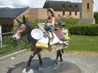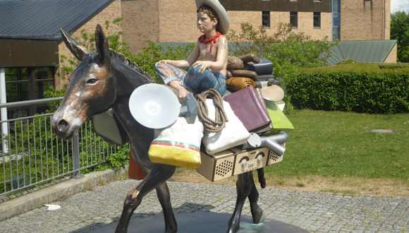 Am nordöstlichen Rand des Fontänenplatzes im Petuelpark gegenüber vom Cafe Ludwig steht das von Pia Stadtbäumer gestaltete Reiterstandbild Go ! Pia Stadtbäumer (geb. 1959) ist eine deutsche Bildhauerin und Installationskünstlerin.. Statt Herrscher oder Feldherr lässt die Künstlerin einen fast unbekleideten Jungen mit Westernhut sein Maultier reiten. Im Gepäck stecken Skateboard, Gettoblaster, Kuscheltier und alles, was ein junger Globetrotter unserer Zeit sonst noch zum Überleben braucht. Es symbolisiert die Insignien und Statussymbole unserer Zeit. Schon seit 2004 befindet sich der Maulesel (Kreuzung aus Esel und Pferd) mit Reiter als Skulptur »Go« auf der Freifläche des Petuelparks. Das Thema Go mag eine Anspielung auf die drehende Sockelplatte und der wiehernde Laut des Maultiers sein. Angeblich ertönen tagsüber laut Info im Internet einmal pro Stunde aus dem bunten Reiterstandbild Gewieher und Eselsgeschrei im Wechsel und der Maulesel mit Reiter dreht sich dann um die eigene Achse. Während meines kurzen Aufenthaltes konnte ich diese Darstellung nicht wahrnehmen. Vor allem bei den Kindern ist der Maulesel mit Reiter sehr beliebt. Wie ich feststellte, haben einige Mütter ihre Kleinkinder auf den Maulesel gesetzt und machten Photos mit dem Smartphone.
