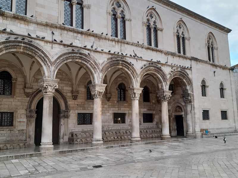 Die große Vergangenheit Dubrovniks ist auch an und in diesem Palast, einem der schönsten weltlichen Gebäude der Stadt, spürbar. Der Rektorenpalast (ursprünglich aus dem 13. Jahrhundert) hat wie die Republik eine bewegte Vergangenheit hinter sich. Er wurde von Schießpulverexplosionen zerstört und etliche Erdbeben haben große Schäden angerichtet. Das heutige Gebäude, unter Zuhilfenahme der alten Pläne des Baumeisters della Cava, stammt aus dem Jahr 1739. Das Atrium ist ein beeindruckendes Beispiel der Baukunst von Onofrio, der auch die Wasserversorgung von Dubrovnik konstruiert hatte. Zum Innenhof, der mit wunderbaren Arkaden dekoriert ist, führen zwei Eingänge. Das große Staatstor wurde nur zu besonderen Anlässen geöffnet. Die reich geschmückten Kapitelle der Säulen stammen aus dem 15. Jahrhundert. Zu sehen gibt hier einen Springbrunnen aus dem 15. Jahrhundert, eine Darstellung des griechischen Heilgottes Äskulap und eine Büste des wohlhabenden Dubrovnik-Gönners Miho Pracat. Im Palast befand sich ein Saal für den Kleinen Rat, für den Rat der Weisen, außerdem die Wohnung des Fürsten, ein Saal für die Richter, mehrere Amtszimmer, eine Registratur, ein Gefängnis, ein Speicher und ein Waffenlager. Eine schöne barocke Balustradentreppe führt in das Obergeschoss. Der Palast diente auch als Wohnung für den Rektor/Fürsten, der jeweils für einen Monat gewählt und für diese Zeit hier regelrecht interniert wurde und den Palast nur aus dienstlichen Gründen verlassen durfte. Der Palast beherbergt seit 1872 auch das Historische Museum, das Möbel, Gemälde, Kleidung, Waffen, Münzen und Urkunden aus der reichen Vergangenheit zeigt. In den Kellerräumen werden Fotos aus dem letzten Krieg gezeigt. In diesem einmaligen Ambiente des Innenhofes werden heute aufgrund der guten Akustik Kammermusik und klassische Konzerte aufgeführt mit dem Dubrovniker Sommerfestival als Höhepunkt.