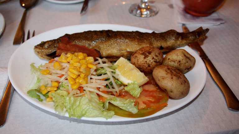 Nach einer Wanderung im Teide-Nationalpark ist auf der Rückfahrt nach Puerto ein Stopp bei dem Restaurant "Aguamansa" unterhalb der Forellenzucht für uns Pflicht. Nach einer hausgemachten Hühnersuppe kommen je nach Größe eine oder zwei Forellen mit Salat und Kartoffeln (7,40 Euro!) und als Dessert -wie üblich- Feigen- Mousse, das wir nur hier bekommen. Miguel ist ein aufmerksamer, freundlicher Wirt. Der Service und das Preis/Leistungsverhältnis einwandfrei.