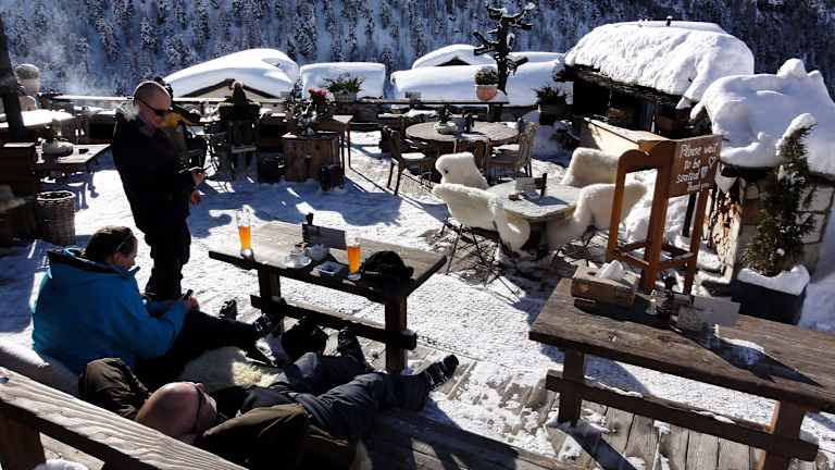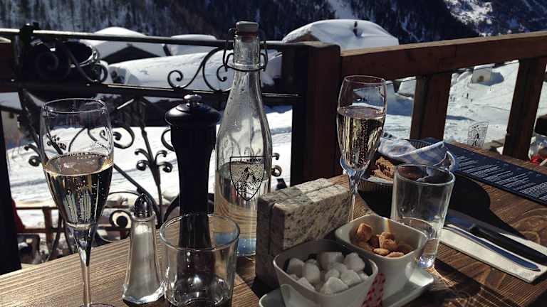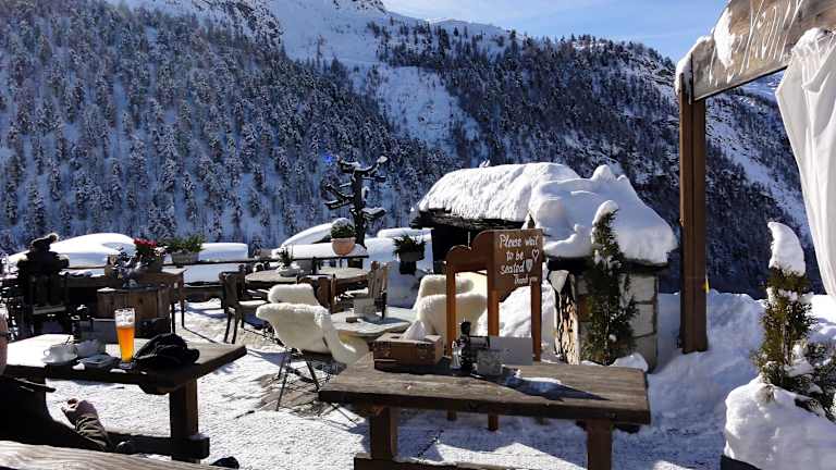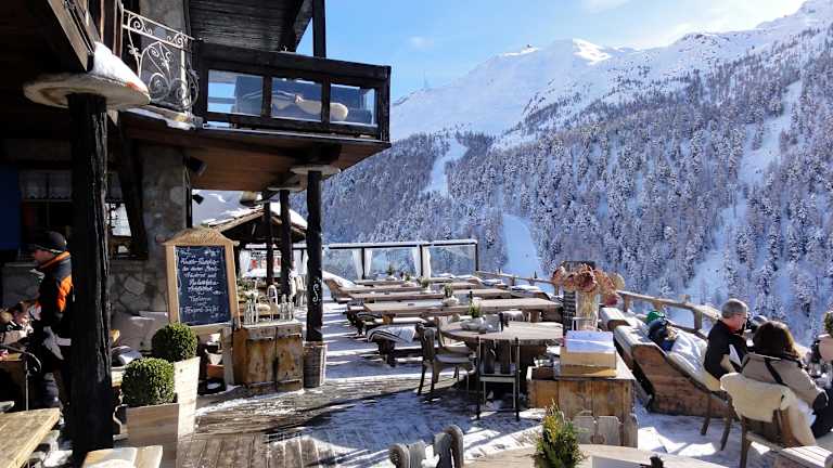 Zu den wohl elegantesten Ski-Hütten im Zermatter Skigebiet dürfte das „Chez Vrony“ im kleinen Weiler Findeln, unterhalb der Sunnegga-Station, zählen. Ich besuchte dieses Bergrestaurant, an dem ich schon mehrfach vorbei gefahren war, an einem frühen Mittag und wurde zunächst am Eingang mit der Frage nach einer Reservierung konfrontiert. Nein, nicht! Nach einem sorgenvollen Blick in den Reservierungsplan bekam ich aber dennoch einen sonnigen Platz zugewiesen und wurde anschließend ausgewählt freundlich und zuvorkommend bedient. Das „Chez Vrony“, Familienbetrieb seit 1922, zeichnet sich nicht nur durch ein zauberhaftes Ambiente und einen perfekten Service aus, sondern überrascht mit seiner Speisekarte auch anspruchsvolle Gaumen: „Pilzrisotto mit Heidelbeeren“, „Spaghetti del Mar mit Riesenkrevetten und Steinpilzen“, Trockenfleischcarpaccio und Käsefondue finden sich ebenso auf der Karte, wie elegante Salatkompositionen, deftige und feine Suppen und natürlich Rösti in vielen Varianten. Die Getränkekarte ist umfassend, die Weinauswahl ein Ritt durch alle Anbaugebiete der Welt: Seitenweise finden sich ausgesuchte Flaschenweine, die preislich zwischen „angemessen“ und „exorbitant“ rangieren. Ich bestellte die überbackenen „Älpler Rösti“ mit Speck und Spiegelei und konnte mich von einer exzellenten Küchenleistung überzeugen. Serviert wurde das Gericht auf einem unfassbar heißen Teller, so dass auch der letzte Bissen bei frostigen Minusgraden noch angenehm temperiert war. Dazu gab es noch ein Brotkörbchen mit kräftigem Sauerteigbrot und Butter als Begleitung. Auf der sonnigen Terrasse sitzt man im „Chez Vrony“ mit Blick auf das Matterhorn und „Hohtälli“ in einer elegant-gemütlichen, durch Glaswände windgeschützten Lounge-Atmosphäre. Im Inneren des über 100 Jahre alten Hauses dominieren niedrige Räume mit Nischen und Winkeln, altes Holz und eine liebevolle Dekoration – traumhaftes Hüttenambiente! Der Besuch bei „Chez Vrony“ ist mir in bester Erinnerung geblieben und ich werde dort sicher noch mehrmals einkehren. Eine Tischreservierung ist in Anbetracht der Tatsache, dass es sich um einen echten „In-Treff“ handelt, mehr als sinnvoll und bewahrt vor Enttäuschung.