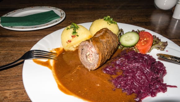 Geordert wurde : 1.Tomatencremesuppe 1 mit Käse- Croutons & Sahnehäubchen 3,90 € 2.Rinderroulade mit Rotkohl und Thüringer Klößen 13,90 € Die Tomatensuppe war sehr fruchtig und konnte auch in der Optik überzeugen . Eine Rinderroulade wurde serviert die augenscheinlich selbstgemacht war . Sie war sehr schnittfest gegart . Zur Füllung :Das Raucharoma des geräucherten Speck war etwas lasch .,die übrigen Komponenten hätten meiner Meinung nach etwas größer sein können . Mit der Soße waren wir geschmacklich sehr zufrieden , nur die Temperatur war unbefriedigend . Der Rotkohl aber insbesondere die Klöße waren sehr gut Der Service war ok . .