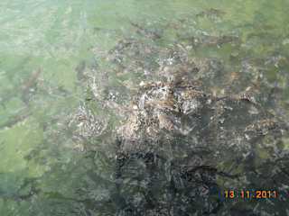 Auf unserem Weg von der Mayastadt Kohunlich nach Chetumal machten wir Mittags Rast an einer sehr schön gelegenen Cenote. Unser Reiseleiter hatte uns das am Ufer liegende Restaurant empfohlen. Wir hatten Gelegenheit zum Schwimmen, was aber keiner aus der Reisegruppe tat. Unser Reiseleiter hatte uns erzählt, daß diese etwa 100 m tief sei, und er uns, sollte jemand einen Schwächeanfall haben und untergehen, nicht retten könne. Da er sehr besorgt war, ließen wir es dann bleiben. Aber das Restaurant habe wir natürlich getestet. Es gab leckere Fischgerichte. Alles war sehr schmackhaft. Es ist ein Familienbetrieb, und so kam später der Opa mit der Gitarre dazu und unterhielt uns sehr diskret. Unser Reiseleite hatte der Besitzerin erzählt, daß ich an diesem Tage Geburtstag habe, und so spielten sie mir ein Ständchen und die Besitzerin und der Reiseleiter sangen dazu. Dies war eine sehr nette Geste.