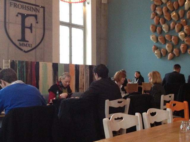 Das Frohsinn Restaurant ist ein wirklich schönes altes Gebäude in Frankfurt. Im Eingangsbereich ist sogar ein roter Teppich. Sehr angehneme Außenterrasse für den Sommer im Innenhof. Dei Qualität der Speisen ist gut, aber die Quantität eher übersichtlich. Es gibt eine gute Auswahl an Kuchen und Torten. Der Service sollte für die Art eines Lokals mit so eindrucksvollem Gebäude etwas verbessert werden. Den Service fanden wir nicht angemessen.