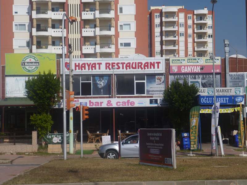 In Lara-Kundu, gegenüber den vielen Shopping Malls befinden sich einige Restaurants. Bei unserem Aufenthalt im November 2013 wurden wir im Hayat Restaurant & Sports Bar immer sehr freundlich bedient. Die Getränke waren stets richtig gekühlt, der Service war schnell und unaufdringlich, die Preise zivil und die landestypischen Gerichte waren auch zu vernünftigen Preise zu bekommen und sehr schmackhaft. Im Gegensatz zu vielen anderen Restaurants und Bars wird die türkische Gastfreundschaft hier noch zelebriert. U.a. gibt es zu jedem Getränk eine Schale mit Nüssen, Oliven o,ä., was in den meisten anderen Bars in den Touristenorten schon lange eingestellt wurde. Nachmittags wird auf vier TV Geräten internationaler Sport (u.a. deutscher Fußball, Bundesliga etc. ) gezeigt.