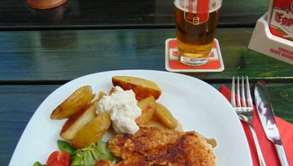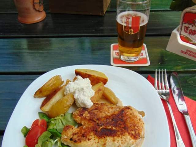 Das kleine, urige Restaurant "Barbakán" liegt etwas "versteckt" vor den Toren der kleinen, wunderschönen und malerischen Stadt Cesky Krumlov, unweit des Busbahnhofs in der Kaplická 26 in 38101 Cesky Krumlov. Von der Straße aus führt ein kleines Schild zu einigen Stufen abwärts. Man kann dort sowohl drinnen, aber vor allem auch draußen auf einer wunderschön begrünten Außenterrasse sitzen und vom "Touristentrubel" entspannen, von der man auf die Moldau hinabblickt. Blöderweise habe ich keine Bilder von der Terrasse gemacht. Die Bedienung war sehr (!) freundlich und sprach auch sehr gut Englisch. Die Menükarte wies tschechische Küche auf - ich hatte eine Hähnchenbrust mit rustikalen Kartoffeln und Gemüse bestellt. Das Gericht war äußerst schmackhaft und mit 365 KC, zusammen mit einem Bier normalpreisig! Ich kann dieses Lokal, gerade aufgrund der toll begrünten Terrasse und der herzlichen Bedienung besonders empfehlen und würde dort sofort wieder einkehren!!