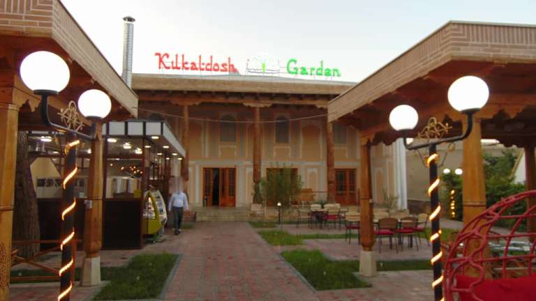 Das Kukaldosh Garden Restaurant befindet sich direkt schräg gegenüber der Nodir Devon Begi Medresse am Lyabi Hauz Wasserreservoir unmittelbar in der historischen Altstadt Bucharas und bietet zahlreiche TIsche unter Baldachinen und zum Teil auch unter Bäumen (im vorderen Teil). Das Ambiente ist wirklich malerisch - speziell am Abend, wenn über den Tischen die gespannte Beleuchtung mit tausenden von kleinen LED Birnchen eingeschaltet wird. Das Restaurant bietet lokale Küche an - die Speisekarten gab es bei meinem Aufenthalt in Buchara nur auf Usbekisch (ebenfalls in kyrillischer Schreibweise) und Russisch. Einige Kellner können allerdings etwas Englisch. Der Oberkellner ließ mich allerdings nicht im vorderen Teil im Garten sitzen, weil er meinte, ich sei alleine und da könnte ich ebenso hinten an den einem kleineren Tischen sitzen. Durchaus verständlich, wenn das Restaurant voll gewesen wäre oder in absehbarer Zeit voll gebucht gewesen wäre. Beides nicht der Fall - ich aß dann hinten und verließ das Restaurant ca. eine Stunde später und lief an mind. 5 leeren Tischen im Garten vorbei ... aber gut .. Die Musik im Restaurant (spanische Lationoschmacht) war einserseits auch unpassend und andererseits viel zu laut. Die Musik fing allerdings auch erst an, als ich schon bestellt hatte, sonst wäre meine Restaurantwahl evtl. auch anders ausgefallen. Die Speisen selbst - Fresh Salad (Tomaten, Zwiebeln, Gurken) und Beef Schaschlik und auch das Bier waren gut und schmackhaft - allerdings hatte ich Hähnchen bestellt (auch auf Russisch, daß ich hiVerständigungsschwierigkeiten ausschließen kann), und trotzdem kam Beef. Die Preise waren wie überall in Buchara - günstig! So hatte ich zusammen ca 85.000 Sum bezahlt = ca 7€. Die etwas ruppige "Ansage", als Einzelgast könne ich ebenso weiter hinten sitzen (vor allem bei leerem Restauant!), hat mich ehrlich gesagt etwas verärgert.