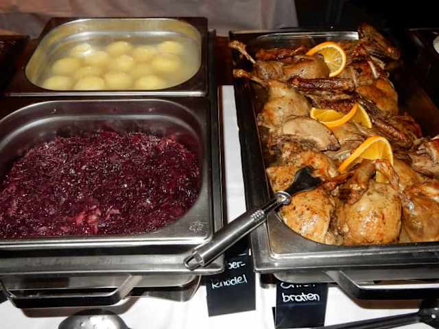 Das letzte Lokal beim Abendessen auf unserer Adventreise war der "Leere Beutel". Alleine der Name klingt einfach lustig, nur auf unserer Liste gab es keine speziellen Speisen - sondern diesmal Buffet. Wenn ich an den ersten Abend denke im Spitalkeller fürchteten wir uns vor dem Buffet. Allein der Gedanke: 160 Personen am Buffet konnten mein Mann und ich uns einfach nicht vorstellen, daß es normalen Bahnen verläuft und zu keinen Tumulten ausartet. Aber siehe da: das Buffet war so aufgebaut, daß 2 gleiche Buffetstrassen aufgebaut waren und es KEIN Gedränge gegeben hat. Das Personal sehr bemüht, flotte Bedienung und die Speisen SUPER lecker !!!! Bei diesem Lokal hat man gesehen, daß wir sicherlich nicht die erste große Gruppe gewesen sind. Die Dekoration weihnachtlich und es war gute Stimmung als Abschluß gut alles gut. Dieses Lokal kann ich nur wärmstens empfehlen (siehe Fotos).