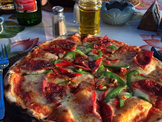 Das Restaurant liegt direkt am Strand. Nach Einbruch der Dunkelheit werden Fackeln am Strand angezündet. Meeresrauschen garantiert! Je nach Wetterlage auch der Sonnenuntergang! Hier beschäftigt ist ein italienischer Koch. Als Abwechslung zur indonesischen Küche fanden wir die Pizza ganz gut! Was nicht so toll war, waren die Ameisen auf den Tischen! Wenn man davon absieht, ganz empfehlenswert.