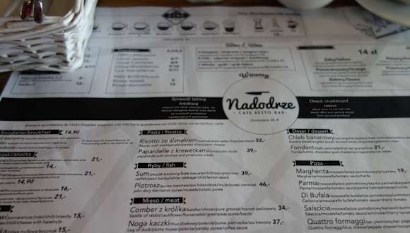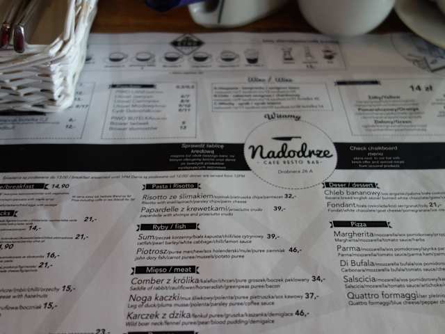 Es handelt sich um ein sehr modernes Lokal. Eine Mischung aus Cafe, Bar und Restaurant. Was mich etwas belustigte ist die eigene Bezeichnung auf Facebook als Spelunke, es ja ein versehen sein oder eine andere Bedeutung auf Polnisch haben. Das Nadodrze liegt etwas abseits der Touristenwege, aber ein Besuch hat sich für uns gelohnt. Abgesehen von der Speisekarte, jeden Tag gibt es eine Auswahl an speziellen Mahlzeiten des Tages. Bei unserem ersten Besuch hatte ich Wildschweinrücken mit Blutpudding, es war Ausgezeichnet. Bei einem anderen Besuch wählten wir Pizza, auch die war sehr gut. Ansonsten sprechen die Fotos für sich.