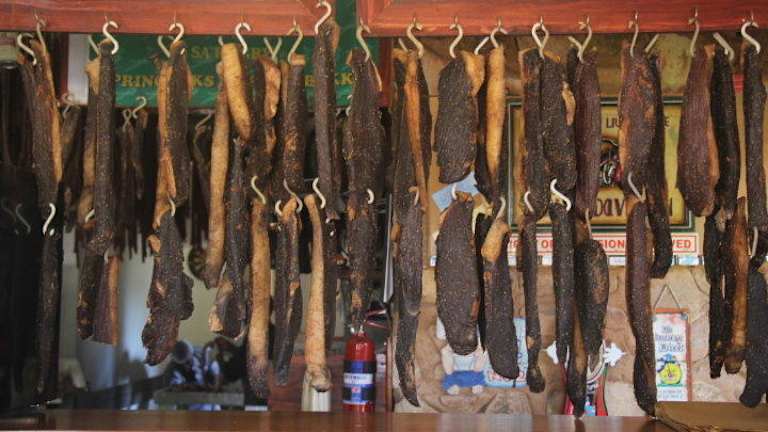 Bei unserer Busfahrt von Hazyview nach Johannesburg legten wir eine Mittagspause in Dullstroom ein. Die Ortschaft Dullstroom ist eine kleine Stadt (ca.6000 Einwohner) in der Provinz Mpumalanga. Die Stadt verfügt lt. Reiseprospekt über die höchste Eisenbahn Station in Südafrika, 2077 m über dem Meeresspiegel. Dullstroom ist ein Zentrum des Forellenangelns, im September und Oktober finden hier verschiedene Wettbewerbe statt. In Dullstroom entspringt auch der Crocodile River, der durch den Krügerpark fließt, außerdem soll Dullstroom einer der kältesten Städte in Südafrika sein. Die meisten Busfahrer die vom Krügerpark nach Johannesburg fahren, legen hier eine Pause ein. Rechts und links der breiten Hauptstraße befinden sich mehrere Restaurants und Souvenirläden. Wir entschieden uns für das Restaurant „The Rose Cottage“ mit seinem hübschen Wirtsgarten. Der Ober brachte uns sofort die Speisekarte. Wir bestellten ein kleineres Gericht, da wir noch eine längere Fahrt nach Johannesburg vor uns hatten. Das Essen und die Getränke kamen innerhalb kurzer Zeit. Wie immer schmeckte uns das südafrikanische Essen vorzüglich. Etwas überrascht waren wir von der Weihnachtsdekoration (Monat Juli) des Restaurants. Das Restaurant war sehr geschmackvoll eingerichtet. Der Besitzer freute sich, als ich seine Gaststube photographierte. Der nette Herr gab mir den Tipp, ich sollte in Dullstroom unbedingt die südafrikanische Spezialität Biltong, bestehend aus luftgetrocknetem Rindfleisch oder Wildfleisch, probieren. Wir gingen daraufhin in die gegenüberliegende Metzgerei Dullstroom Butchery Bilton King und kauften zwei Packungen dieser Spezialitäten. Die Biltongs waren sehr preiswert und schmeckten wie der Gastwirt sagte, auch besonders gut.
