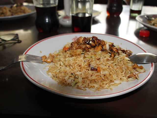 Zusätzlich zu unserem Indischem Visum benötigen wir auch eine Einreisegenehmigung (‚Restricted Area Permit‘) für Sikkim. Das Visum beantragte unser indischer Reiseleiter direkt am Grenzübergang zu Sikkim in Rangpo. Die Stadt Rangpo grenzt an Westbengalen und liegt am Fluss Teesta. Da die Einreisegenehmigungen etwas dauerten, machten wir Mittagspause in unmittelbarer Nähe der Grenze, im Hotel Rangpo Tourist Lodge. Das Hotel hatte auch ein hauseigenes Restaurant. Unsere Reisegruppe waren die einzigen Gäste im Restaurant. Der geräumige Raum des Restaurants war einfach jedoch gastfreundlich eingerichtet. An der Stirnseite des Raumes befand sich ein Fernsehapparat und an der Wand der Gaststätte sah man einige Bilder von Bergen des Himalajas. Die Speise- und Getränkekarte lag bereits auf dem Tisch. Kaum haben wir Platz genommen, war der höfliche Kellner bereits da. Das reichhaltige Speiseangebot von der Rangpo Tourist Lodge erschwerte uns zwar die Auswahl. Wir gingen jedoch mal wieder kein Risiko ein und bestellten gebackenen Reis (120 Rupien) und Coca Cola (70 Rupien). Innerhalb kurzer Zeit bekamen wir schon die Getränke. Auch das Essen wurde uns nach etwa 10 Minuten serviert. Der gebackene Reis schmeckte uns vorzüglich und auch die Portionen waren vollkommen in Ordnung. Der Kellner war sehr freundlich und auch die Preise für Getränke und Speisen fanden wir vollkommen in Ordnung. Wir können das Restaurant im Hotel Rangpo Tourist Lodge auf jeden Fall weiterempfehlen. Neben dem Hotel Rangpo Tourist Lodge befand sich auch das schön eingerichtete Rancpo Tourist Centre. Das Touristenzentrum war zwar geöffnet, es war aber weit und breit kein Bediensteter zu sehen. Wie ich an einer Wandtafel sah, wurden Werbungen für Touren zum Kailash (6714m) und Manasarover (4586 m) den höchstgelegenen Südwassersee der Welt in Tibet gemacht. Der Manasarovar ist ein Heiligtum der Hindus und der Buddhisten und so auch ein wichtiges Ziel von Pilgern. Er zählt zu den drei heiligen Seen in Tibet. Der Rundweg auf dem traditionellen Pilgerweg misst 103 km (Manasarovar Parikrama), für den die Pilger zwischen zwei und vier Tagen benötigen Sehr überrascht war ich auch von einem Inder in Rangpo mit einem FC Bayern München Trikot. Als ich den jungen Inder ansprach und erzählte ich komme von München, freute er sich riesig. Natürlich musste ich auch ein Photo von diesem indischen FC Bayern Fan machen.