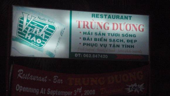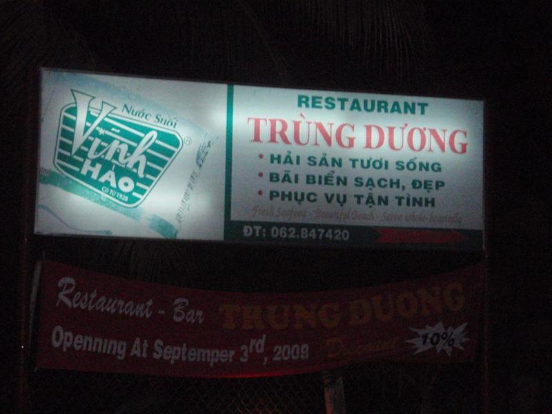 Kleines Restaurant, welches von einer sehr netten Familie bewirtschaftet wird. Das Restaurant befindet sich neben dem Hotel „Coco Beach“ , man kann es vom Strand und von der Straße aus erreichen. Das Essen ist hervorragend – gute vietnamesiche Küche – und dazu auch noch sehr preiswert. Empfehlen können wir den fangfrischen „Red Snapper“ – ein 1, 2 kg schwerer Fisch hat frisch gegrillt und mit Knoblauchreis serviert ca. 6 € gekostet. Auch die Shrimps oder Tiger Prawns sind frisch gegrillt sehr lecker. Wie auch bei anderen Restaurant wird im Trung Duong abends immer eine große Schale mit Frischfisch aufgebaut, aus der man seine Wahl für das Abendessen treffen kann. Ein kleines Highlight sind die Grillgerichte (wie zum Beispiel gegrilltes Hähnchen- oder Schweineflisch, oder gegrillte Meeresfrüchte). Man bekommt dann einen privaten „Grillmeister“ inklusive einem kleinen Grill neben den Tisch gestellt. Empfehlenswert sind ebenfalls die vietnamesiche Suppe, wahlweise mit Shrimps oder Fisch zubereitet, das gebratene Gemüse und die leckeren Mango-Shakes (keine Angst, die werden zwar mit Eis zubereitet, aber das ist für den Magen absolut verträglich, wie haben die Shakes in Massen getrunken und hatten keine Probleme). Auch vor den angebotenen Salaten aus frischem Gemüse (Tomaten-, Gurken- oder dem Trung Duong-Salat) braucht man keine Angst zu haben. Ausstattung: mit Terrasse / Garten