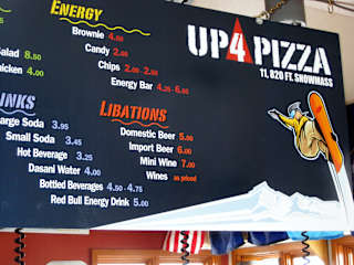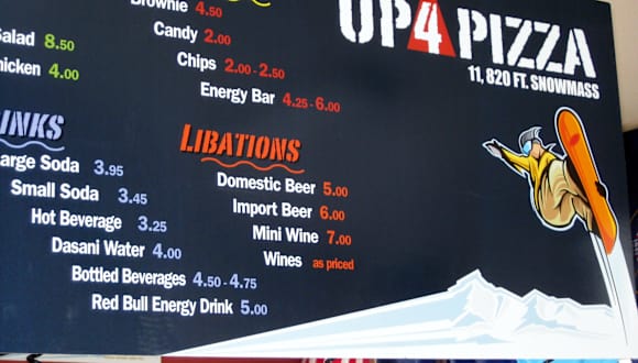 Durch Zufall bin ich in die Pizzeria "Up4 Pizza" oberhalb des Sessellites in Snommass geraten (es hing eine deutsche Fahne draußen) und ich muß sagen, es hat sich gelohnt. Randy Kimmel zaubert in 3500 m Höhe leckere Pizzen für einen kleinen Mittagssnack. Ferner stehen auf dem Tresen Cookies zum Probieren. Randy erläuterte auch die Namensherkunft seiner Pizzeria und seine deutschen Wurzeln. Für die Mittagspause in Snowmass, sehr zu empfehlen.