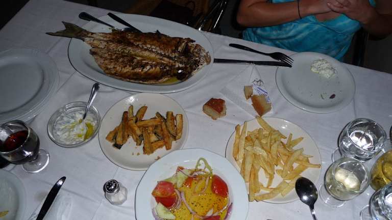 Das Restaurant WALTAKI in Longos am Nordpeloponnes in Griechenland bietet eine ausgezeichnete Gelegenheit in sehr einfacher Umgebung am Meer fangfrischen, exzellent zubereiteten Meeresfisch zu speisen. Uns wurde dieses Restaurant von Einheimischen empfohlen. Als wir Abends kamen, war nur ein Tisch mit Gästen belegt.....davon sollte man sich aber nicht abschrecken lassen (Ende August), die zumeist einheimischen griechischen Gäste waren schon wieder bei der Abreise... Die auf Eis gelagerten Fische wurden uns zur Auswahl präsentiert und gemäß der Empfehlung der Köchin zubereitet. Mit den typisch griechischen Beilagen hatten wir ein exquisites wunderschönes Abendessen mit Sonnenuntergang am Meer.. Kosten zu Dritt mit 1 kg Fisch: 60 EUR