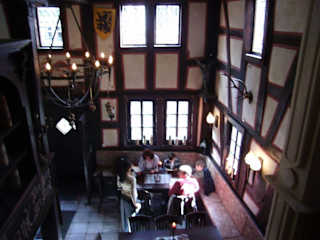 In einem schon von außen ansprechend renoviertem und innen urig gestalteten Fachwerkhaus befindet sich das empfehlenswerte Restaurant "Zum Burgkeller" (vgl. Fotos). Zum rustikalen Ambiente gehören nicht nur Ritterrüstungen schmiedeeiserne Deckenlampen, sondern auch einfache Eichenholztische, auf denen die Gerichte ohne Servietten gebracht werden. Das Angebot ist, wie die hübsch ausgemalte Speisekarte verheißt, sehr vielfältig und herzhaft-delikat, enthält auch vegetarische Gerichte. Die Preise liegen zwischen 8 und 16 Euro. Sowohl beim Probeessen als auch zwei Wochen später mit Arbeitskollegen waren wir alle sehr zufrieden. Empfehlenswert sind u. a. die Waidmannsplatte (7, 80 €) und die Burggeisterrolle (10, 80 €). Wer noch etwas schafft, sollte den Apfelstrudel als Nachspeise ordern. Als Getränke werden diverse und schmackhafte Fassbiersorten angeboten. Den Portugieser würde ich mir aber nicht noch einmal bestellen; da gibt es im fast gegenüber liegenden Weinhaus Schultes schon bessere Weine. Als alkoholfreies Getränk ist ein "Kiba" (Kirsch-Bananensaft) zu empfehlen, aber möglichst ohne Eis. Nach einem so herzhaften Essen empfiehlt sich der Genuss des vorzüglich schmeckenden Westerwälder Kümmels, eines Kräutertropfens oder - wer die Geschmacksrichtung mag - ein Grassl-Bärwurz. Beim 1. Besuch haben nur einige Raucher oben auf der Empore gestört, im Erdgeschoss war die Luft glücklicherweise jedes Mal rauchfrei. Der Service ist sehr freundlich, entgegenkommend und aufmerksam. Leider befinden sich die (zumindest sauberen) Toiletten vermutlich baulich bedingt im Untergeschoss in mittelalterlich kleinen, fensterlosen Räumen und entsprechen nicht dem, was der anspruchsvolle Tourist vorzufinden gewohnt ist. Adresse: Fischmarkt 10, 65549 Limburg. Bei schönem Wetter ist mit größeren Besucherzahlen zu rechnen und eine Vorbestellung ratsam: Tel. (06431) 21 92 94. Da das Restaurant mitten in der Altstadt liegt, verfügt es über keine eigenen Parkplätze. Empfehlenswert ist die ganz in der Nähe (ca. 80 Meter) liegende und preiswerte Tiefgarage (50 Cent pro Stunde) in der Sackgasse. Von da nur ein paar Schritte den Berg hoch gehen und man kommt direkt auf die Rückseite dieses Restaurants heraus. Öffnungszeiten: Mo. bis Fr. ab 17 Uhr, am Wochenende und "ab Frühling" bereits ab 11 Uhr.