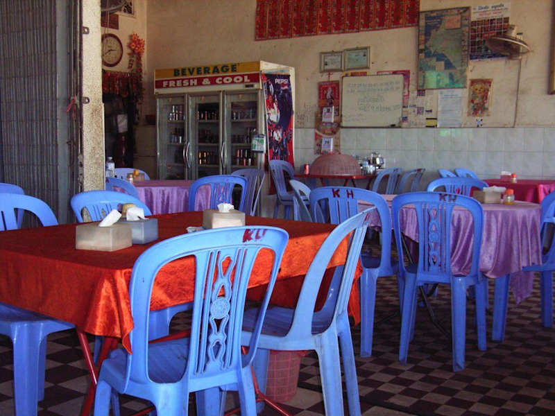 In Down Town Sihanoukville ( Hauptstr. ) befindet sich ein gepflegtes gut ausgestattetes kambodschanisches Restaurant. ( Internet Anschluss > E-Mail > Fax > Telefon etc. ) möglich . Die auf mehren Seiten gut ausgezeichneten Preise in Dollar . Es befindet sich ca. 100 m vor der Kreuzung , auf der Rechten Seite , in Richtung zum Gr. Markt . Die Einrichtung besteht aus Holzbestuhlung + Tischen und 2 Bedienungen , die auch immer wieder nachfragen , ob man noch was möchte . Leider habe ich keine Speisenkarte fotografiert oder div. Speisen . Nur ein Bild des Lokals von Außen .