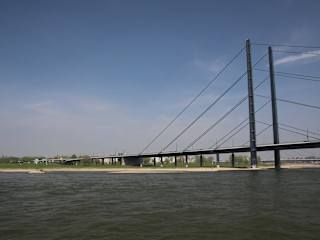 Markante Brücke am Rheinufer. Ideal um von hier eine Tour entlang des Ufers Richtung Medienhafen zu starten - sowohl die Brücke selbst wie auch die vielen Schiffe auf dem Rhein bieten viele Fotomotive.