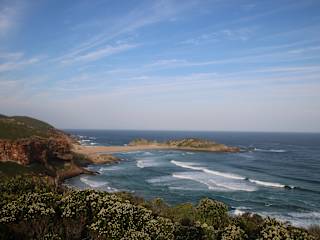 Am südlichen Ende von Plett Bay befindet sich auf einer Halbinsel das Robberg Nature Reserve, Von hier aus hat man einen atemberaufenden Blick über die langgezogene Bucht mit dem kilometerlangen, feinen Sandstrand. Kurz hinter dem Gate zum Park befinden sich Parkplätze (unbedacht), mit einer kleinen Erfrischungsbude (bzw. Camper) und einigen Toiletten. Von hier aus starten die Wanderungen - es werden drei unterschiedliche Rundwege, mit steigenden Schwierigkeitsgraden und Entfernungen angeboten - 3, 5 und 11 km. Die Wanderung am Robberg Island Nature Reserve ist absolut empfehlenswert. Für die 5 und erst recht 11 km lange Rundtour ist eine gute Grundkondition und Trittsicherheit in jeden Fall erforderlich, da die gesamte Tour immer wieder bergauf und bergab führt und stellenweise keinen Schatten bietet. Dafür erlebt man atemberaubende Ausblicke, kann hunderten von Robben, Pinguine und Vögel erspähen und wandert an wunderschönen Klippen, Felsen und Küstenabschnitten. Ungefähr auf der Mitte der Hintour führt bei "Witsand" ein steiler, sandiger Weg hinab über eine gewaltige Sanddüne zum Südstrand. Der Rückweg führt entlang der felsigen Steilküste sehr nah am Wasser. Da hier die Brandung sehr stark ist, reicht die Gicht bis auf den Pfad. Wir empfehlen zur Streckenbewältigung unbedingt gutes Schuhwerk und reichlich Wasser mitzuführen - man ist fast die ganze Zeit der Sonne ausgesetzt. Aber die Tour lohnt sich in jedem Fall - denn hinter jeden neuen Ecke gibt es unbeschreibliche Aussichten und hunderte von Foto-Motiven