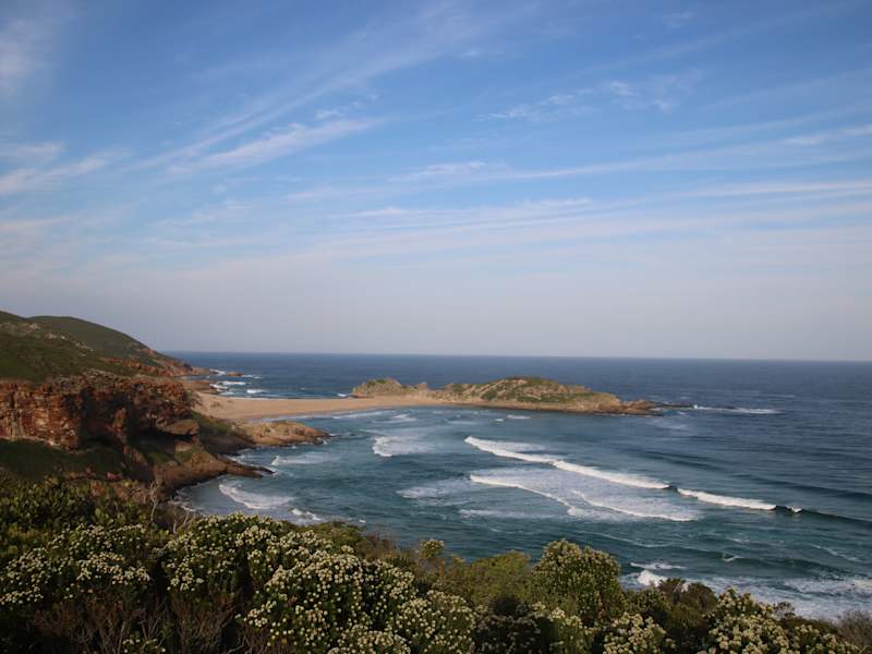 Wir waren an einem Sonntag im afrikanischen Winter dort und bekamen trotzdem einen Parkplatz. Zunächst hatten wir vor, links herum an der Küste entlang, hier trafen wir auch einen Hai-Beobachter, aber hierzu muss man im weiteren Verlauf schon ziemlich schwindelfrei sein, so dass wir zurückkehrten. Anschließend liefen wir geradeaus vom PP auf dem Sattel und kamen an einen wunderschönen Aussichtspunkt, The Gap genannt. Hier hat man Blick auf das Meer und nach Norden Richtung Plettenberg, aber noch schöner nach Süden auf eine unendlich lange Sandbucht. Ab diesem Punkt muss man wieder schwindelfrei sein und für den steilen Abstieg feste Schuhe anhaben. Leider fehlte der Hinweis auf Trittsicher- und Schwindelfreiheit!