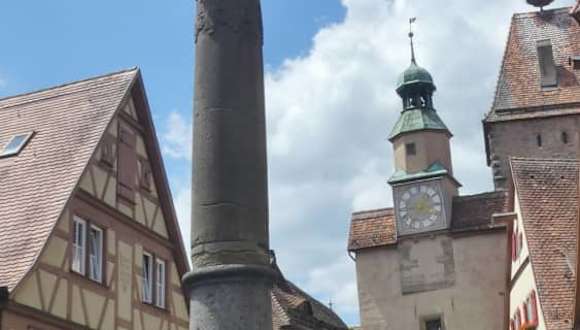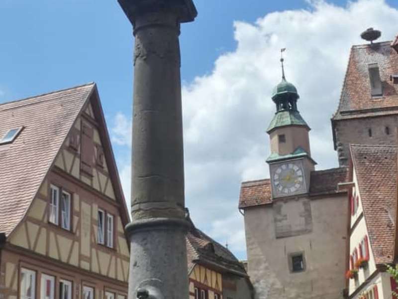 In Rothenburg ob der Tauber findet man viele Brunnen. Einer davon ist der Röderbrunnen. Es gibt hier in Rothenburg zwar viele Brunnen die sicherlich schöner sind als dieser, aber von hier hat man einen tollen Blick zum Röderbogen und zum Markusturm (auf letzterem befindet sich ein Storchennest und als wir im Juni 2022 hier waren, waren Störche in dem Nest und brüteten). Uns hat der Blick von hier äußerst gut gefallen.