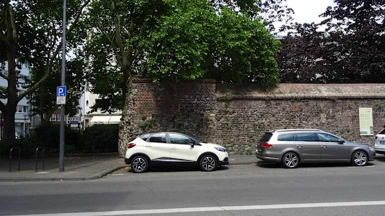 Die römische Stadtmauer hatte eine Länge von etwa 4 Kilometern und umschloss das etwa 100 Hektar große antike Kerngebiet der Colonia Claudia Ara Agrippinensium. Die Stadtmauer war mit 19 mächtigen Rundtürmen bewehrt und hatte elf Tore, durch welche die wichtigsten Verkehrsachsen zum Hafen und zum Umland verliefen. Etwa 700 Meter der römischen Stadtmauer sind heute noch oberirdisch an verschiedenen Orten in der Stadt zu erkennen. Ein Teilstück befindet sich zwischen der Zeughausstraße und Burgmauer, neben dem ehemaligen Zeughaus. An der Abbruchkante kann man die Dicke der Mauer deutlich erkennen. Andere römische Spuren findet man in unmittelbarer Nähe, z. B. den außergewöhnlich schmuckvoll dekorierten Römerturm an der Zeughausstraße.