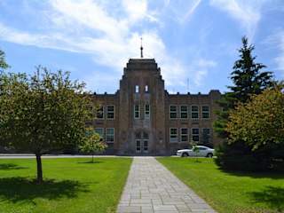 Bereits im Vorfeld meiner sommerlichen Pennsylvania-Rundreise hatte ich mich über mögliche Sehenswürdigkeiten in und um Roscoe informiert und bin dabei sehr schnell auf die Roscoe Central School gestoßen. Diese ist mir schon allein aufgrund der Größe auf der Straßenkarte aufgefallen. Mit welchem Schmuckstück ich es tatsächlich zu tun bekommen würde, wurde mir erst vor Ort so richtig bewusst. Die Roscoe Central School liegt im Nordwesten der Innenstadt von Roscoe und ist daher sowohl zu Fuß als auch mit dem Auto sehr gut zu erreichen. Idealerweise geht man entlang der Old Route 17, die als County Road 179 und als Highway 206 quer durch Roscoe führt. Schließlich führt die Orchard Street nach Westen von der Old Route 17 ab. Hier kann man bereits das Schulgebäude sehen. Aber Vorsicht! Hier gilt eine Einbahnstraßenregelung! Man fährt daher am besten zunächst ein Stück geradeaus und dann links direkt vor das Schulgebäude. Diese kleine Straße führt zusammen mit der Academy Street entgegen dem Uhrzeigersinn um die Grünfläche vor der Central School herum. Hier wird man auch außerhalb der Schulzeiten genügend Parkplätze vorfinden. Mich hat das gewaltige Schulgebäude bereits lange vor meiner Reise nach Roscoe fasziniert. Viele New England Schools kennt man bereits aus Film und Fernsehen, und hier in Roscoe, der Trout Town USA, findet man dann tatsächlich solch ein Schulgebäude vor. Dabei liegt Roscoe gute zwei Autostunden von Manhattan entfernt inmitten des Catskill Parks in den Bergen und ist an sich nur ein Ort für Angler. Umso mehr darf man sich dann wundern, in dieser kleinen Gemeinde solch eine Schule vorzufinden. Da das Fotografieren der Schule nichts kostet, ist die Budgetfreundlichkeit natürlich perfekt. Man sollte allerdings darauf achten, außerhalb der Schulzeiten zur Schule zu fahren, da diese immer noch in Betrieb ist. Die Architektur des 1939 erbauten Schulkomplexes ist für mich scher zu definieren. Groß, gewaltig, mächtig und trotzdem irgendwie schön anzusehen. Wenn man von der Old Route 17 auf die Schule zugeht oder zufährt, kann man ihre Ostfassade in voller Pracht bewundern. Die Fassade misst bestimmt gute 80 Meter und wird vor allem durch den erkerförmigen Mittelteil mit seinem Turm geprägt. Der Zustand der Schule wirkt auf mich trotz der mehr als 80 Jahre noch sehr gut. Ein schönes Gebäude, von dem sich entsprechend gute Bilder machen lassen.