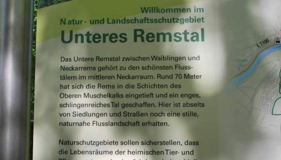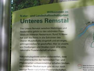 Ein herrlicher Rundwanderweg entlang der Rems beginnt in Neckarrems in der Mühläckerstraße. Dort gibt es zwar keinen ausgewiesenen Parkplatz aber man kann jederzeit dort ein Auto abstellen. So machen es auch Radfahrerclubs. Der Weg ist asphaltiert und führt an den ehemaligen Steinbrüchen vorbei, immer im Naturschutzgebiet. Die Wanderung empfiehlt sich an warmen Sommertagen, es geht meistens unter Bäumen voran. Der Weg führt bis zur Brücke in Hohenacker (Hegnacher Straße ). Dann überquert man die Rems über die Brücke und geht dann nach links an der Rems entlang. In Neckarrems kommt man dann wieder an die Brücke die herüber zum Parkplatz führt. Eine leichte Wanderung, ich mag aber keine Zeit für den Weg angeben, es ist jedermanns Überlegung ob er sich die rund 5-6 km zutraut.