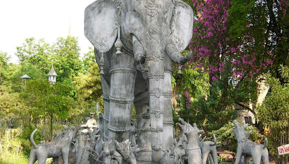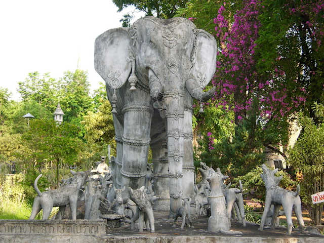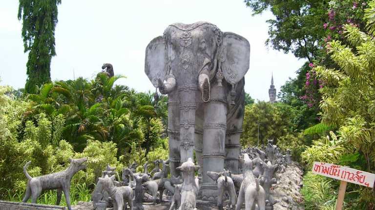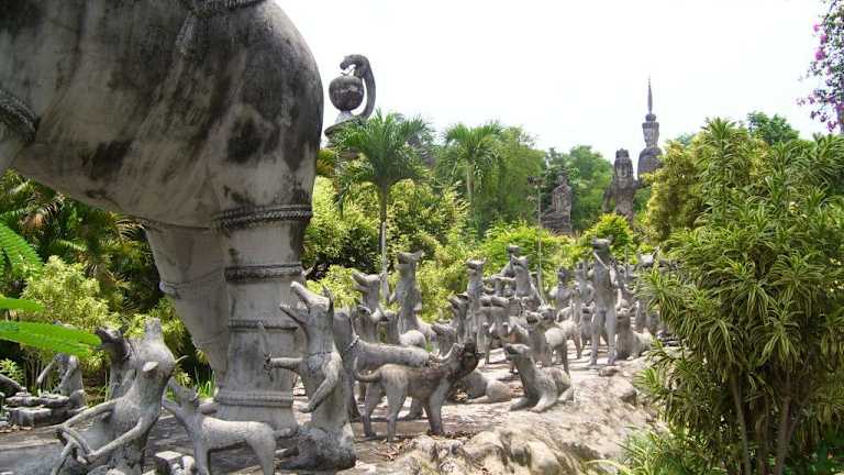 Der Park liegt etwa 5 km östlich der Stadt Nong Khai, der erste Eindruck, man stehe einem im Dschungel versunkenen Tempel gegenüber, täuscht. Tatsächlich handelt es sich um einen Garten mit skurrilen Beton-Skulpturen, der gegen Ende der 1970er von Luang Puu Bunleua Surirat, einem thailändisch-laotisch-indischen Schamanen geschaffen wurde - einem „Verrückten“, wie die Bewohner des Provinzstädtchens schmunzelnd erzählen. Er liegt mumifiziert unter einer Glaskuppel. Die wohl eindruckvollste Statue zeigt den meditierenden zukünftigen Buddha, wie er von einer siebenköpfigen Naga vor einem Gewittersturm beschirmt wird. Weitere Info http://de. wikipedia.org/wiki/Sala_Keo_Kou