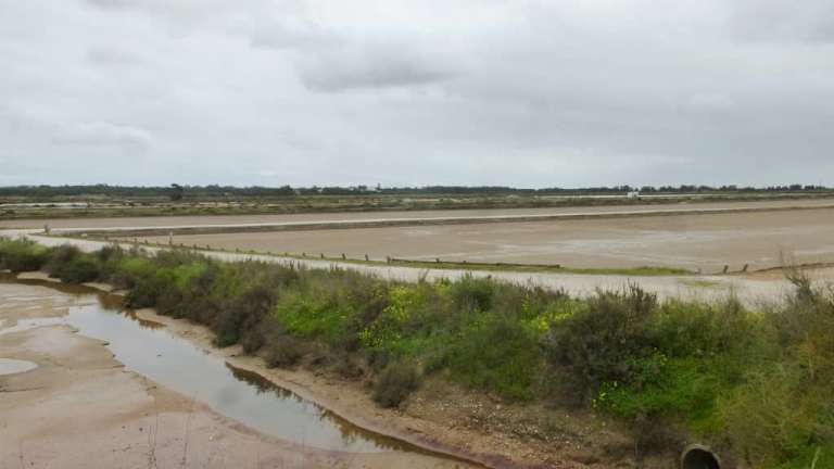 Zwischen Flughafen und dem Atlantik findet man Salinen (Salinas) vor, in denen noch immer Salz durch Verdunstung gewonnen wird. Manche der Salinenfelder wurden zwar aufgegeben, andere werden aber noch geflutet und das Salz wird noch „abgebaut“. Man läuft über breite Wege entlang der Salinenfelder und sieht in die mit Wasser gefüllten Felder, auf denen teilweise ein weißer Schaum aus Salzkristallen ist. Die einzelnen Salinenfelder sind durch Dämme voneinander abgetrennt. Neben den Salzfeldern gibt es auch Seen, in denen man Flamingos und andere Vögel beobachten kann. Da die Entfernung zum Flughafen von Faro nicht weit ist, ziehen immer wieder startende oder landende Flugzeug über die Salinen und über die Köpfe der Menschen, die hier unterwegs sind, hinweg.