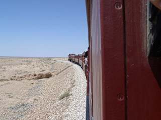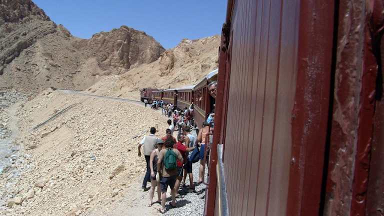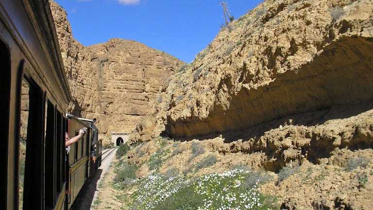 Auf unserer Tour durch Tunesien haben wir es uns nicht nehmenlassen, von Metlaoui aus ca 2 Stunden mit dem berühmten Zug durch die Berge zu fahren. Der Zug fährt über eine bereits 1906 gebaute ca 16 km lange Eisenbahnstrecke, An 2 Punkten hält der Zug an, und man kann wunderschöne Fotos machen. Die Fahrt führt durch Tunnel und beeindruckende Fels- und Berglandschaften. Am Endpunkt ist ein etwas längerer Aufenthalt, da die Lokomotive an den hinteren Teil des Zuges angekoppelt wird, Der Zug war ein Geschenk Frankreichs an den letzten Bey Tunesiens und ist dem "Orient Express" nachempfunden.Jeder Wagen ist anders ausgestattet.. Der Zug fährt die gleiche Strecke zurück, es lohnt sich dann in der Bar einen Tee oder auch ein Bier zu trinken.