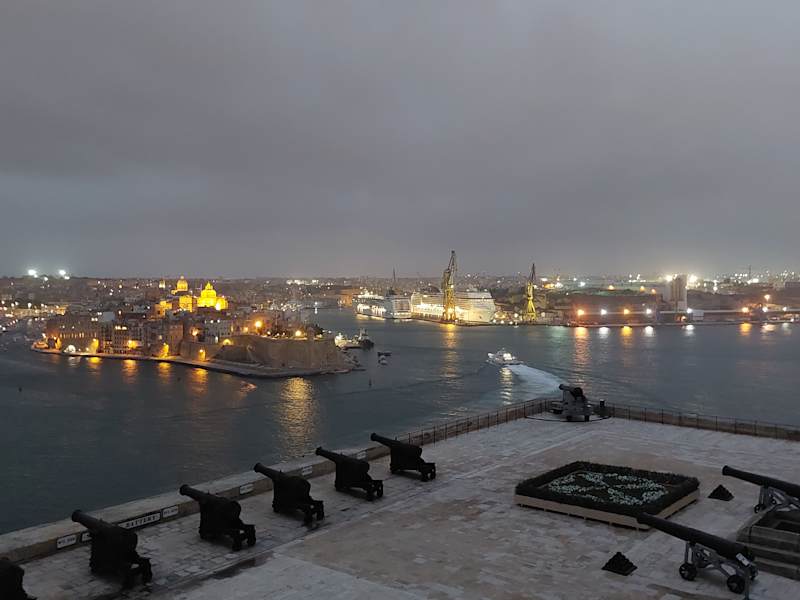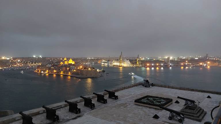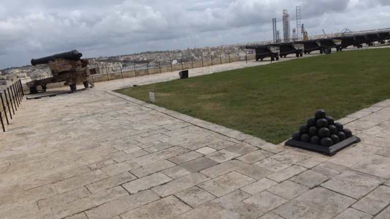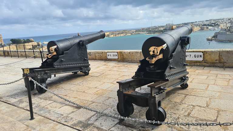 Von den Upper Barrakka Gardens gut einsehbar stehen die historischen Kanonen hoch über Vallettas Grand Harbour auf der östlichen historischen Befestigungsmauer. Mittags um 12 Uhr wird ein Schuss abgefeuert, der den Seeleuten einst für die Einstellung ihrer Uhren diente, inzwischen aber hauptsächlich eine touristisch interessante Tradition ist.
