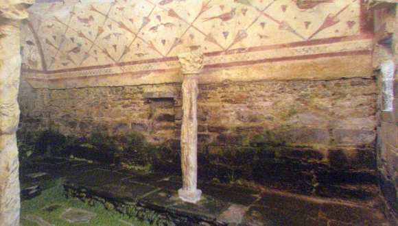 Hier in Bóveda ist nicht die Kirche das Interessante, sondern das, was unter ihr liegt: Eine römische Hinterlassenschaft. Die Erkundungen sind noch nicht abgeschlossen und deshalb steht auch nicht endgültig fest, ob es sich hier um ein Badehaus oder ein Grabmal handelt. Den meisten Besuchern wird dieser akademische Disput eh gleichgültig sein, er wird sich vielmehr an den Wandmalereien erfreuen. Dies auch, weil es nicht gerade leicht zu finden ist. Umso überraschender dann, dass es in dem winzigen Dorf ein Informationsbüro gibt, und ein freundlicher Mitarbeiter eine ausführliche Broschüre überreicht und mitgeht, um das Tor unterhalb der Kirche aufzuschließen.