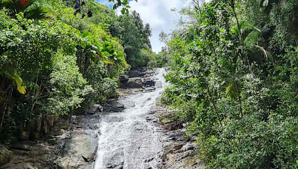 Gleich hinter der Kirche in Port Glaud zweigt eine kleine Betonstraße von der Hauptstraße ab. Folgt man dieser kommt man an einem Souvenierstand vorbei, bis man schließlich einen kleinen Parkplatz erreicht. Von diesem aus führt ein Trampelpfad durch den Dschungel zum Wasserfall. Einfach dem Rauschen des Wasserfalls folgen. Das Auto entwerder an der Hauptstraße parken oder bis zum kleinen Parkplatz fahren. Es gibt mehrere Einheimische die Führungen zum Wasserfall anbieten, dies ist jedoch nicht notwendig. Hat man den kurzen Fußmarsch geschafft erblickt man den tosenden Wasserfall, der sich in ein Becken ergießt. Hier läßt es sich auch gut Baden. Nicht vom etwas trüben Wasser abschrecken lassen.