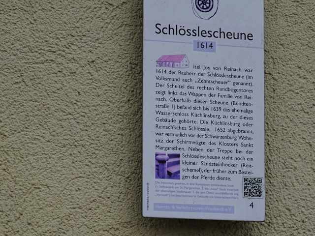 Ursprünglich befand sich hier auf dem Areal wohl ein Wasserschloss (Küchlinsburg bzw. Reinach´sches Schlössle) welches Mitte des 17. Jahrhunderts abgebrannt sein soll. Die Schlösslesscheune wurde Anfang des 17. Jahrhunderts errichtet. Ein interessantes Detail - bei der Treppe der Scheune steht ein kleiner Sockel aus Sandstein. Dieser soll früher beim Besteigen der Pferde gedient haben.