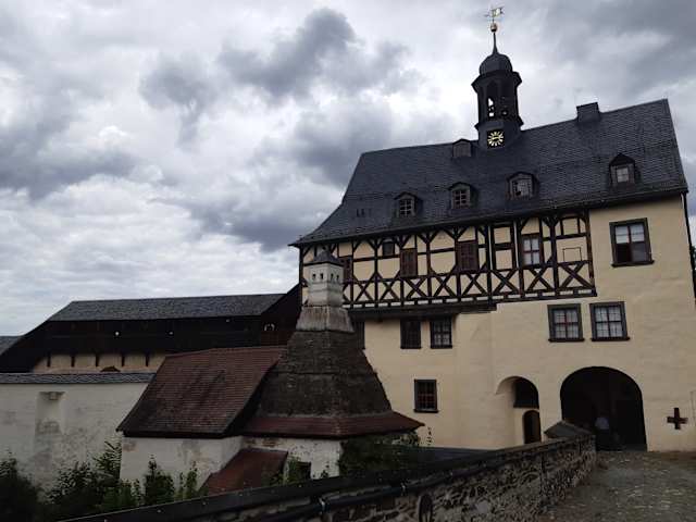 Vom Parkplatz 1 km Richtung Burgkhammer - eine schöne Wanderung, nicht sehr anstrengend- oder mit dem Auto bis Burgk. Eine schön sanierte Anlage mit Stilelementen verschiedener Epochen und faszinierendem Blick über Fluss, Täler und Wälder.