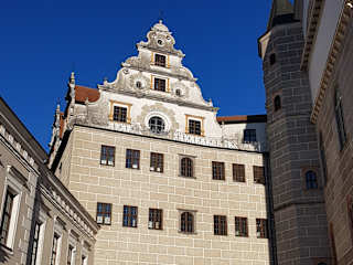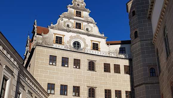 Das Schloss Neuburg liegt majestätisch über den Donau und dominiert den Ort Neuburg. Die alte Burg an selber Stelle wurde ab 1527 zu einem Renaissanceschloss umgestaltet. Zur damaligen Zeit hat das Neuburger Schloss aufgrund der kunstvollen Ausstattung und der QWaulität zu den besten Schlossbauten im Lande gehört. Vieles ist in diesem mächtigen Schloss noch original erhalten und auch zu sehen. Im Schloss selbst gibt es einige Museen, die man besuchen kann und die sehr wertvolle Sammlungen zeigen. Interessant sind das Archäologie-Museum, die Staatsgalerie (Flämische Barockmalerei), das Fossilienkabinett und das allgemeine Schlossmuseum Neuburg an der Donau. Die Schlosskapelle ist übrigens der früheste protestantische Kirchenraum in Deutschland. Zu den kostbarsten Schätzen, die in Schloss Neuburg zu sehen sind, gehören die Textilien aus dem Ursulinenkloster im Ort. Eintritt 5,50