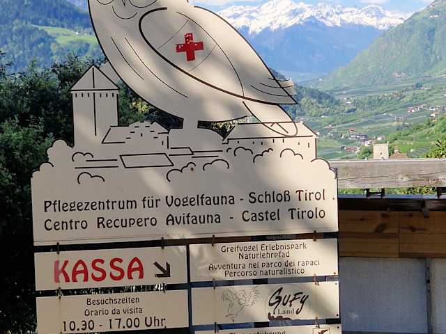 Schöner Weg zu Fuss zum Schloss Tirol. Mit Museum und toller Greifvogel-Schau gleich beim Schloss. Gutes Restaurant.