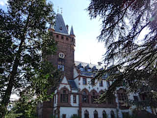 Das Weinheimer Schloss ist ein ehemaliges Schloss der Fürsten der Kurpfalz. Schlossturm und Zwischenbau wurden 1868 im Stil der Neugotik durch Freiherr Christian Friedrich Gustav von Berckheim (1817–1889) errichtet. Vorausgegangen war der Abbruch des Kellereiflügels des kurpfälzischen Schlosses. Der 39 Meter hohe Schlossturm, der dem Blauen Turm in Wimpfen nachempfunden wurde, zeigt neugotische Architekturelemente. Christian legte auch den noch heute bestehenden und der Öffentlichkeit zugänglichen Exotenwald unweit des Schlosses an. Das Schloss zeichnet sich noch heute durch die Vielfalt der verschiedenen Baustile aus. Seit 1938 befindet sich das Schloss mit dem angrenzenden Park im Besitz der Stadt, die ihre Verwaltung in den Schlossgebäuden untergebracht hat. DAs Schloss kann man nicht besichtigen, jedoch im Restaurant Hutter im Erdgeschoss, bekommt man einen schöenen Einblick.