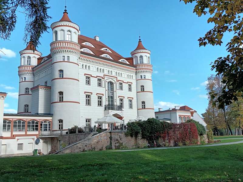 In einem herrlichen Landschaftspark liegt das Schloss Schildau, das 1603 errichtet wurde. König Friedrich Wilhelm III. kaufte Schildau als Geschenk für seine Tochter Luise. Im Zweiten Weltkrieg waren hier Gefangene interniert. Nach dem Krieg wurde das Schloss dann als Ferienheim genutzt. Sein Bauzustand verschlechterte sich und es stand lange leer. 1995 erwarb es ein Italiener, der das Schloss von Außen erneuern ließ. Vor dem Innenausbau brannte der Dachstuhl 2002. Nach einer sehr aufwendigen Sanierung hat das Schloss sein heutiges Aussehen erhalten. Die gesamte Anlage, die jetzt als Hotel genutzt wird, kann man nur als sehr gelungen ansehen. Wir haben hier nicht gewohnt, sondern nur die Anlage uns angesehen und eine Kleinigkeit zum Kaffee zu uns genommen. Der kurze Aufenthalt war sehr schön, wie schon Palac Wojanow Hotel eingebettet in die Parkanlage ist toll.