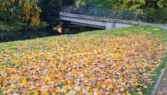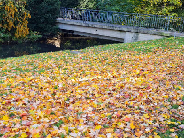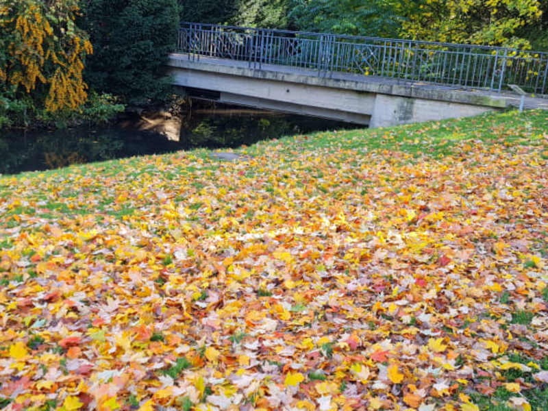 Riesiger Park mit grossen Fluss durch den Park verlaufend. Spielplatz vorhanden und viele Bäume und Sitzbänke. Wunderschön und bunt im Herbst.